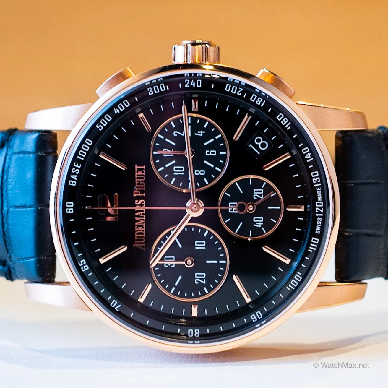 From a design perspective the chronograph models expand on the simple time only by adding a tri-compax layout to the blue and black lacquer dial. The sub-dials are done in the same gold color (rose or white) and are quite legible as the contrast is high. The subdials, like the logo, the indices, and the 12 hour marker, are applied using the same galvanized process described above.