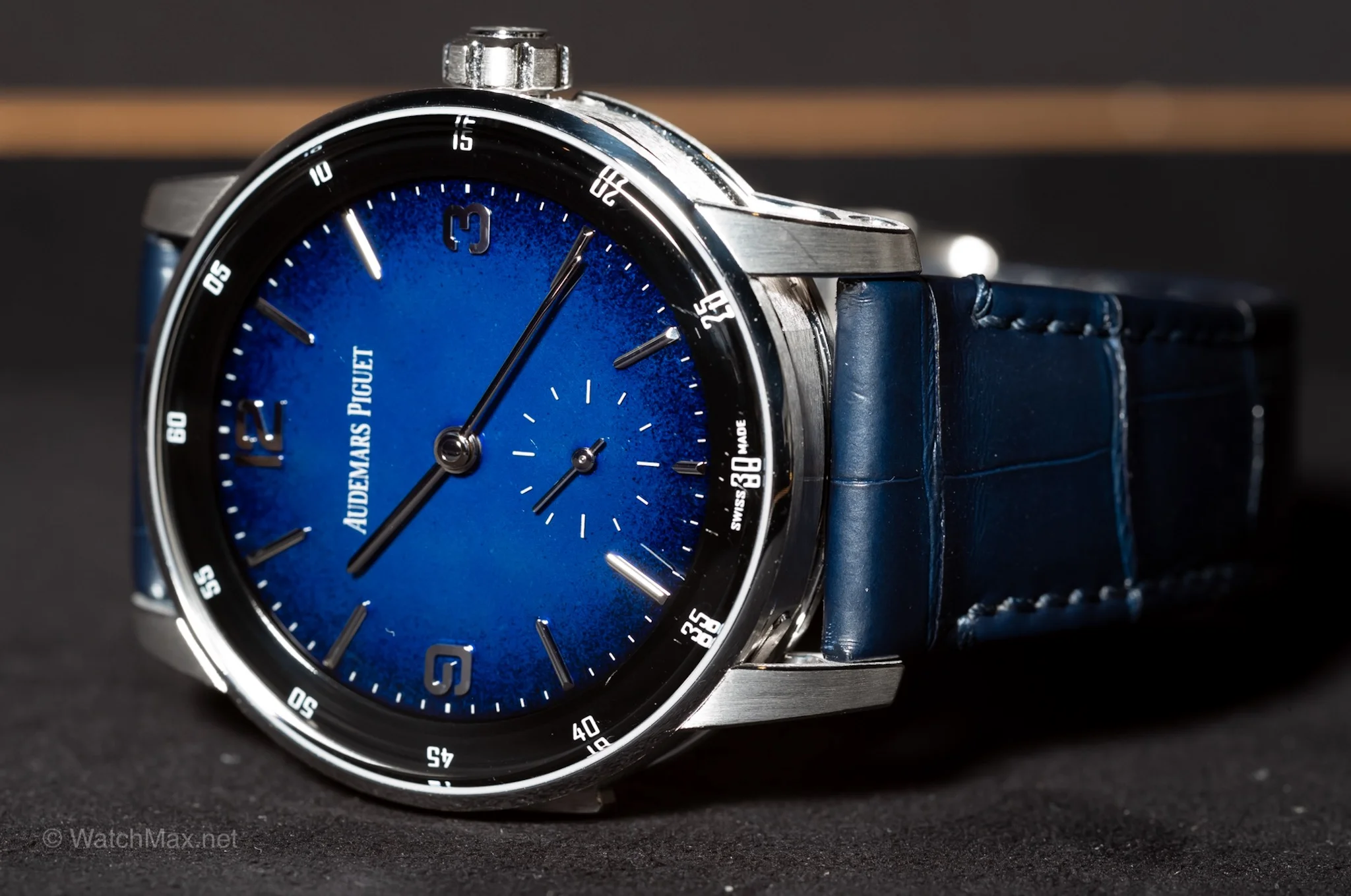 First is the dial, it’s done in lacquer in three colors: white, blue, and black. While a bit disappointing in person as to the potential high expectations, the lacquer dial is rich and deep in color. So the black is deep black, almost disappearing and the white and blue almost appearing like ceramic. This is due to the multiple layers of lacquer applied, up to 12 according to AP.