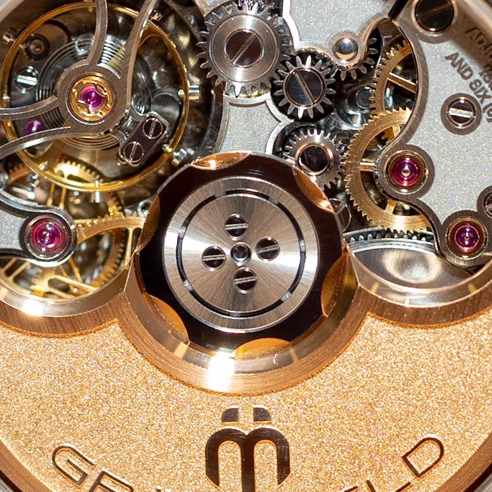 Necessarily providing an oscillating mass, that while obscuring the movement at times, is itself a thing of beauty. Done in 22 karat solid gold and completely fished by hand, the rotating mass shows the logo representing the two brothers; and will wind the movement with a full day of autonomy with just over 600 revolution of the mass around the ceramic ball bearing center.